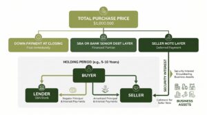- Security: The seller retains a security interest in the business assets or the buyer’s ownership stake, typically subordinated to any senior SBA or bank debt in priority.