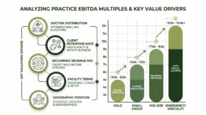 - Corporate Consolidators Pay Higher Multiples: Private equity-backed platforms pay above-market multiples for practices with minimum EBITDA thresholds, multi-doctor structure, and geographic fit with their existing networks.